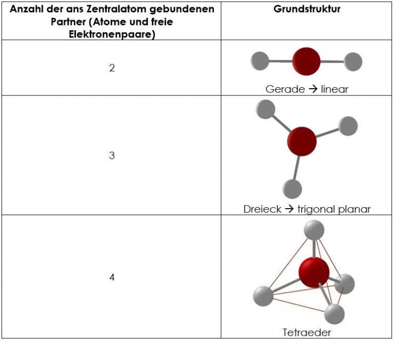 Der räumliche Bau eines Moleküls lässt sich ganz einfach mit einem einfachen Modell ableiten, unter der Annahme, dass Elektronen sich aufgrund ihrer gleichen Ladung (negative Ladung) möglichst weit voneinander abstoßen. Wichtig: Bei diesem Modell betrachtet man Bindungen (zwischen Atomen) und eine Bindung wird aus mind. zwei.